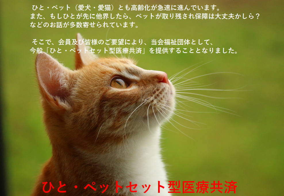 そこで、会員及び皆様のご要望により、当会福祉団体として、今般「ひと・ペットセット型医療共済」を提供することとなりました。